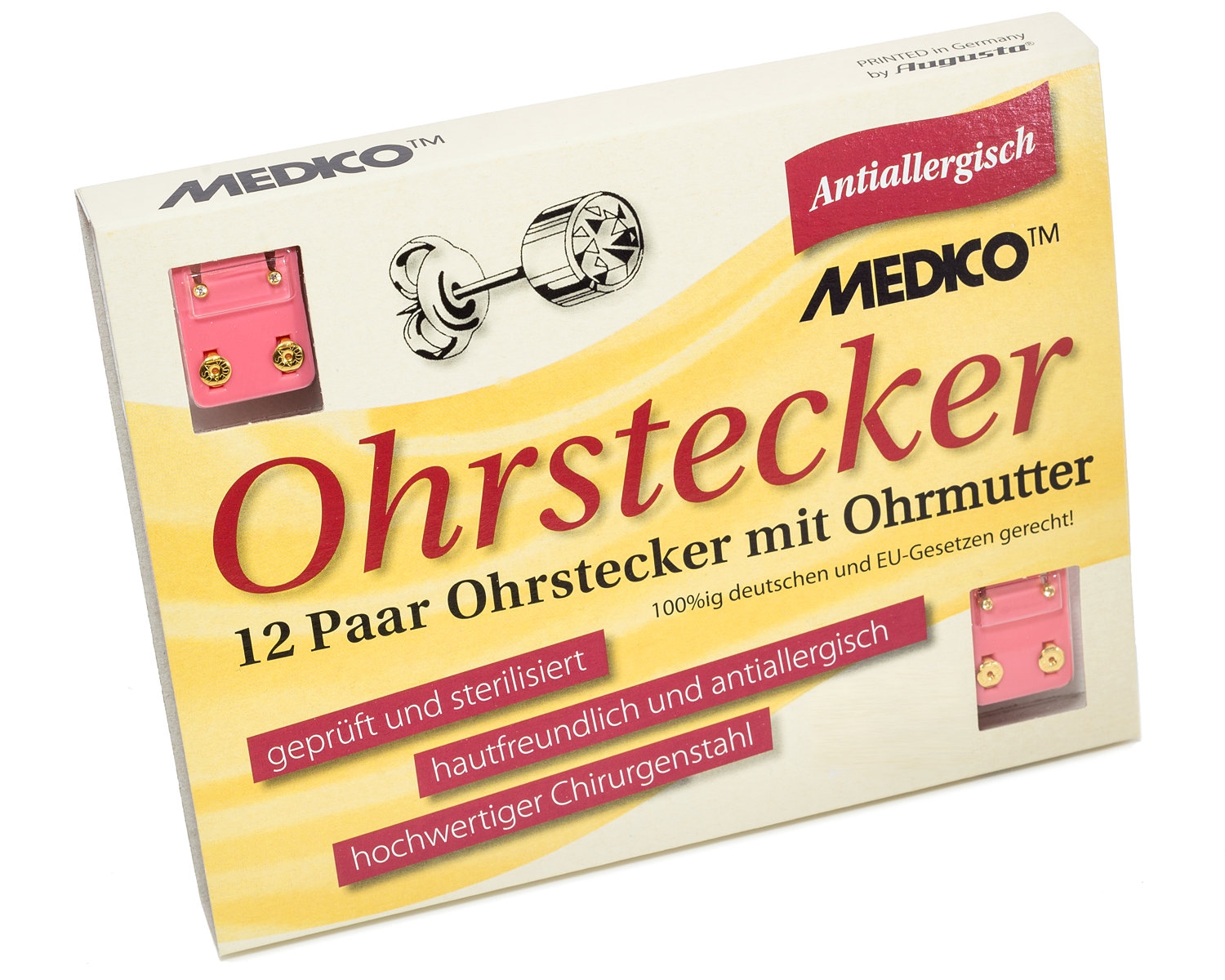 Medizinische Erstohrstecker -mini- mit Ohrmutter, aus antiallergischem Stahl - nickelabgabefrei. Geprüft und sterilisiert. Farbe: gold/krilstall (mit facettiertem Stein) , Form: rund , VE = 12 einzeln verpackte Paare.