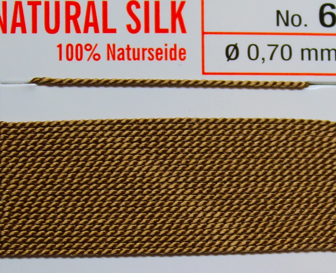 Durch ihre gute Reißfestigkeit und ihre geringe Dehnung lässt sich die Perlseide, aus 100% Naturseide, sehr gut verarbeiten und knüpfen. Der 2 m lange Kordelfaden ist mit 1 Nadel versehen. Perlseide - Farbe: beige = mittleres Braun - Nr.10 = Ø 0,9 mm