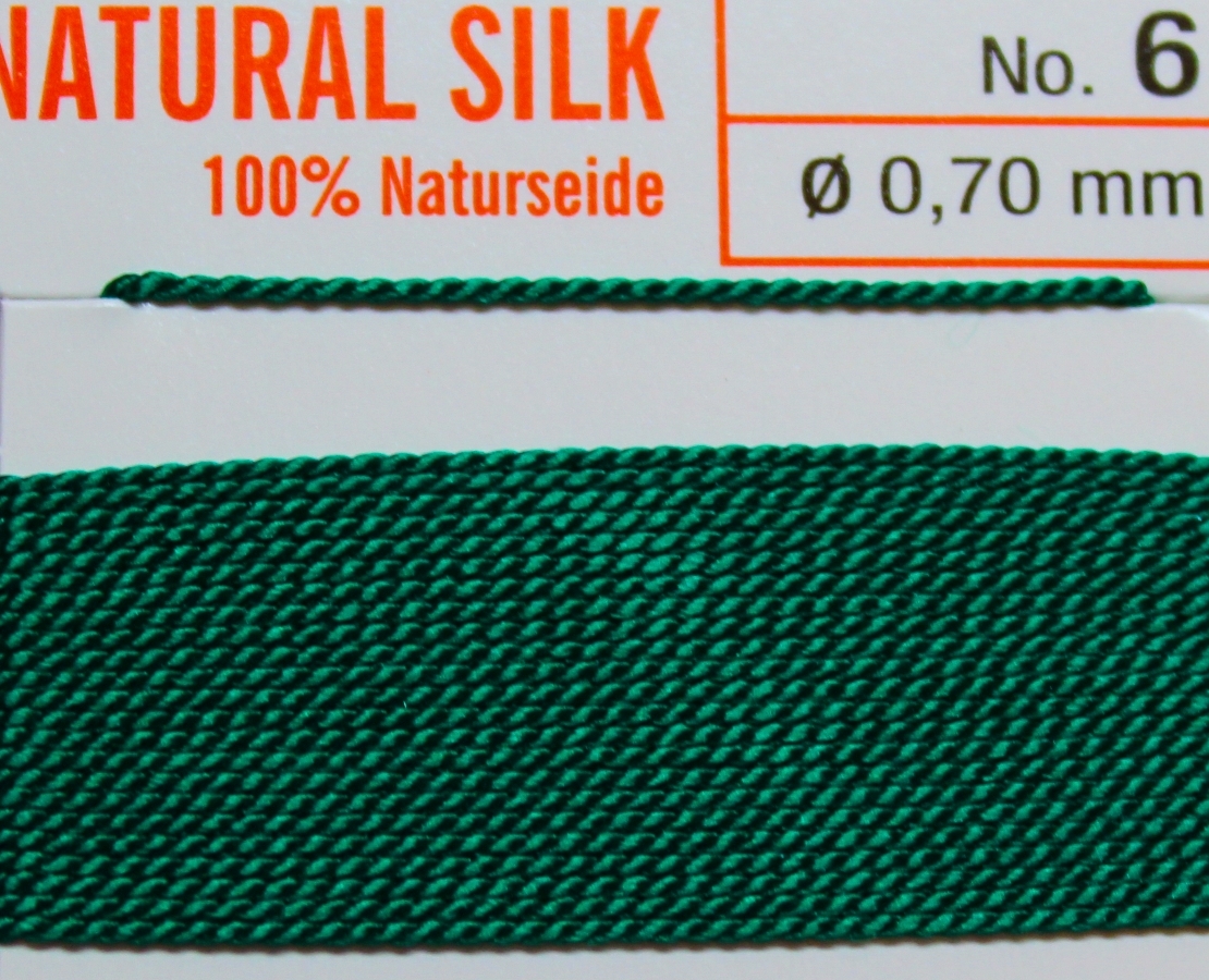 Durch ihre gute Reißfestigkeit und ihre geringe Dehnung lässt sich die Perlseide, aus 100% Naturseide, sehr gut verarbeiten und knüpfen. Der 2 m lange Kordelfaden ist mit 1 Nadel versehen. Perlseide - Farbe: grün - Nr.12 = Ø 0,98 mm