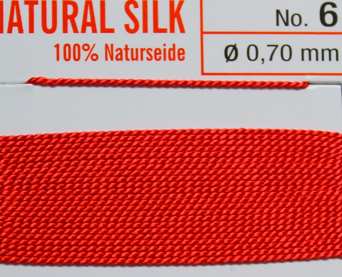 Durch ihre gute Reißfestigkeit und ihre geringe Dehnung lässt sich die Perlseide, aus 100% Naturseide, sehr gut verarbeiten und knüpfen. Der 2 m lange Kordelfaden ist mit 1 Nadel versehen. Perlseide - Farbe: korallrot - Nr. 14 = Ø 1,02 mm