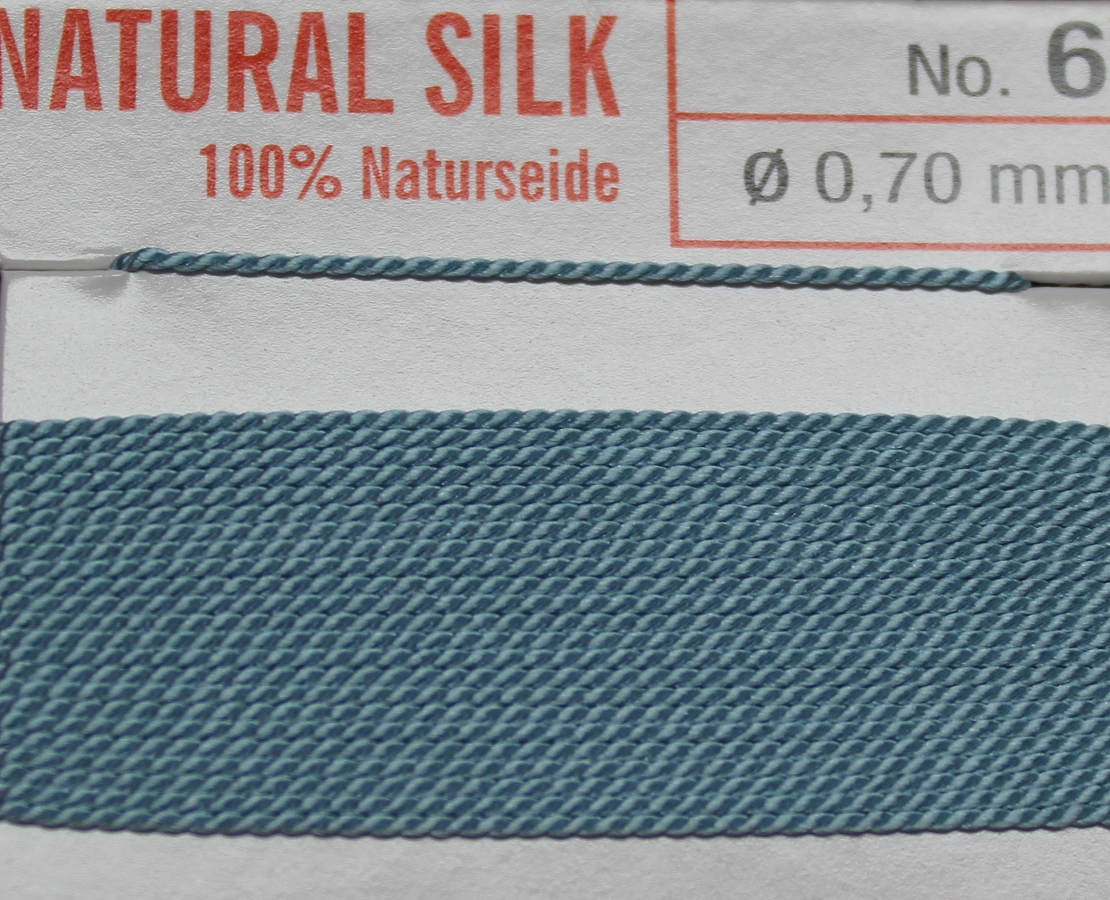 Durch ihre gute Reißfestigkeit und ihre geringe Dehnung lässt sich die Perlseide, aus 100% Naturseide, sehr gut verarbeiten und knüpfen. Der 2 m lange Kordelfaden ist mit 1 Nadel versehen. Perlseide - Farbe: türkis - Nr. 5 = Ø 0,65 mm