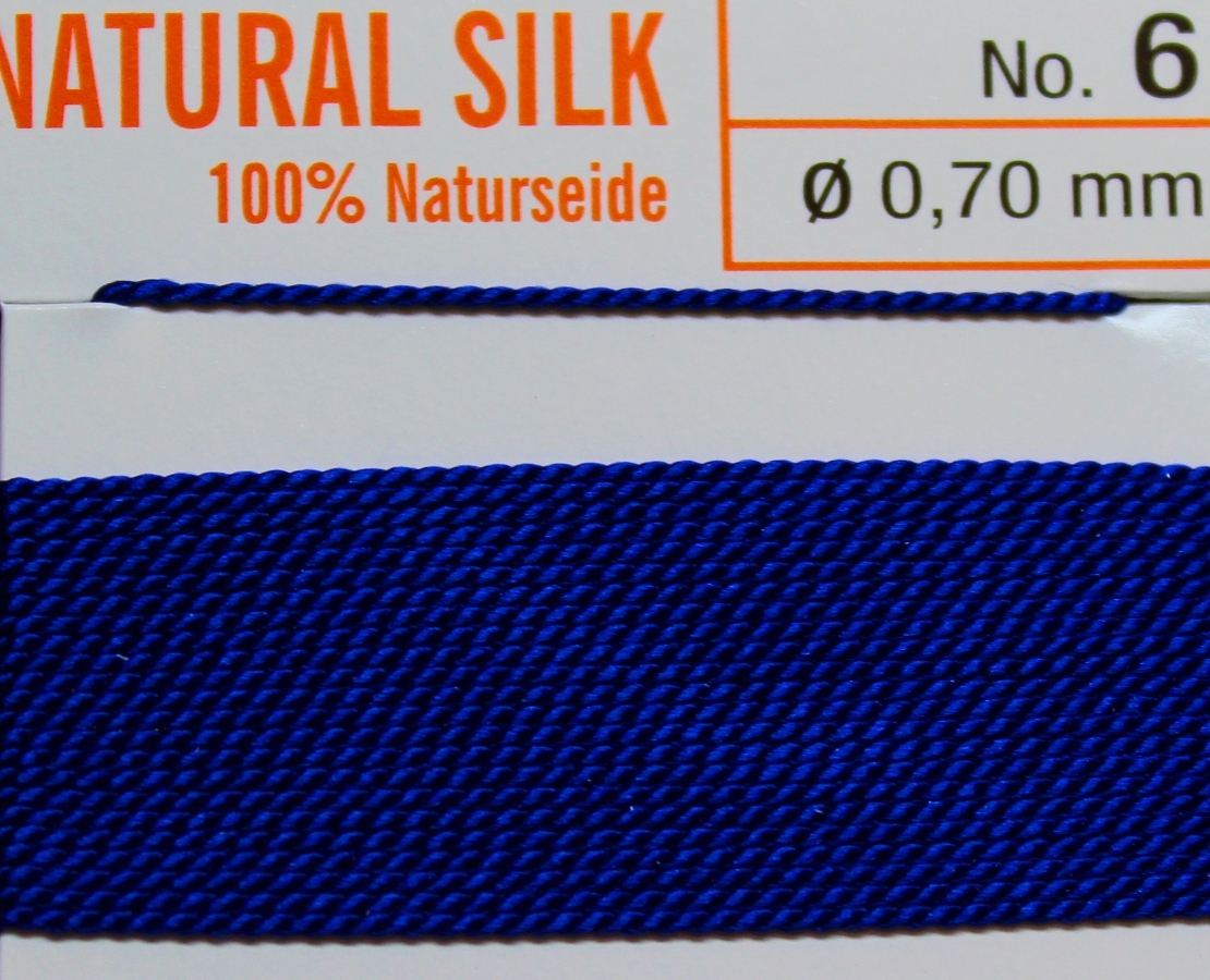 Durch ihre gute Reißfestigkeit und ihre geringe Dehnung lässt sich die Perlseide, aus 100% Naturseide, sehr gut verarbeiten und knüpfen. Der 2 m lange Kordelfaden ist mit 1 Nadel versehen. Perlseide - Farbe: dunkelblau - Nr.6 = Ø 0,70 mm