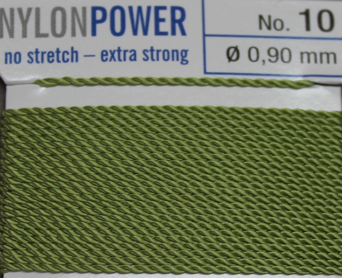 NylonPower ist ein starkes, extra behandeltes Nylon, welches doppelt so reißfest ist wie herkömmliches Nylon. NylonPower Seide läßt sich unter Zug um 3-4% dehnen und geht nach Zugfreigabe wieder auf die ursprüngliche Länge zurück. Der 2 m lange Kordelfaden ist mit 1 Nadel versehen. NylonPower-Perlfaden - Farbe: jade-grün - Nr. 10 = Ø 0,90 mm