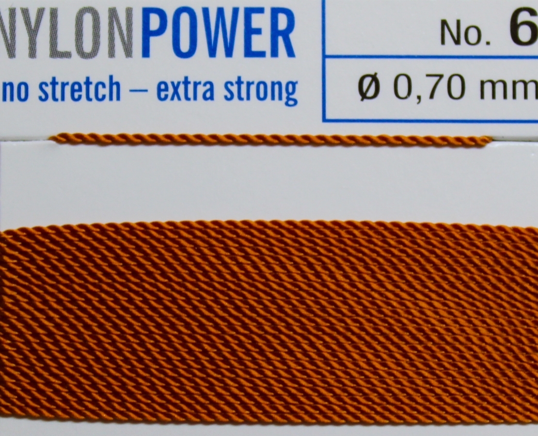 NylonPower ist ein starkes, extra behandeltes Nylon, welches doppelt so reißfest ist wie herkömmliches Nylon. NylonPower Seide läßt sich unter Zug um 3-4% dehnen und geht nach Zugfreigabe wieder auf die ursprüngliche Länge zurück. Der 2 m lange Kordelfaden ist mit 1 Nadel versehen. NylonPower-Perlfaden - Farbe: karneol = braun-orange - Nr. 5 = Ø 0,65 mm