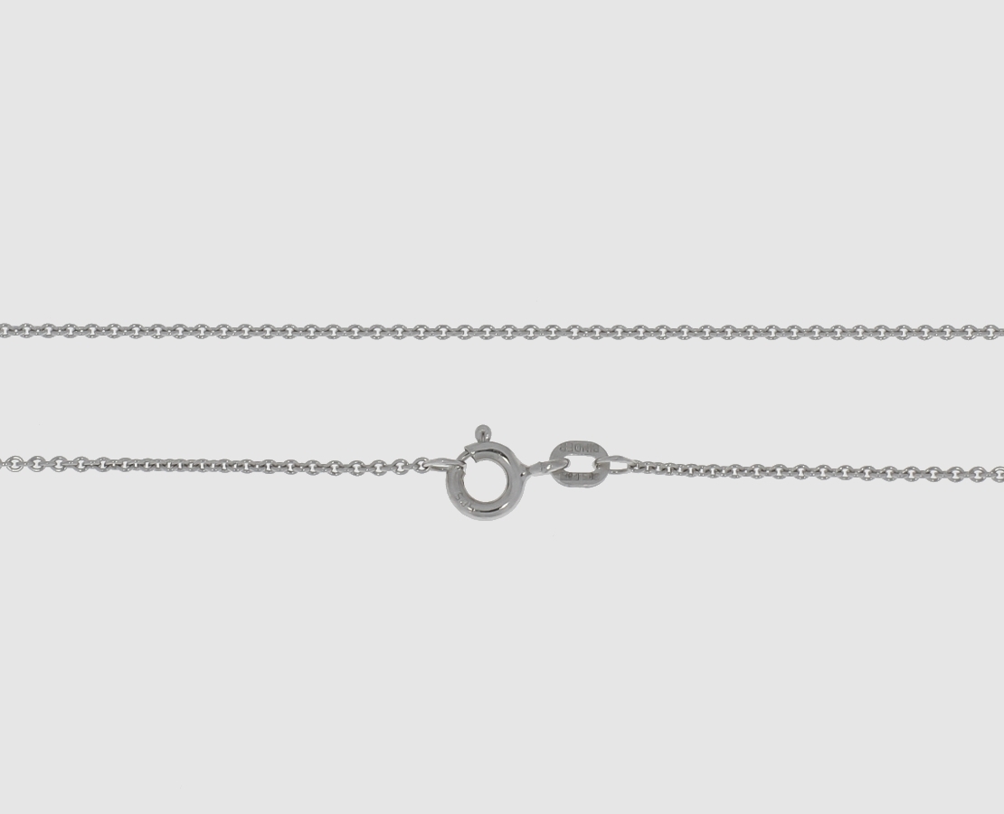 Klassische Rund-Ankerkette, mit Ösenbreite 1,1 mm, aus 585 Weißgold. Die Collierkette hat eine Länge von 45 cm und ist mit einem Federring versehen.