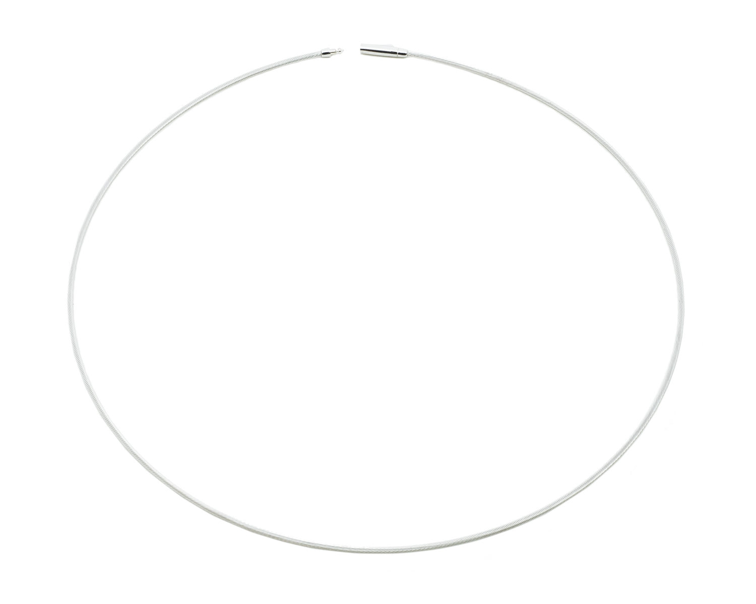 Dieser Halsreif besteht aus mehreren feinen Sterling Silber Drähten, die zu einem Seil -mit Ø 1,25 mm- gedreht sind. Er liegt elegant rund um den Hals und ist mit einer schmalen Drückerschließe versehen. Länge: 42 cm.