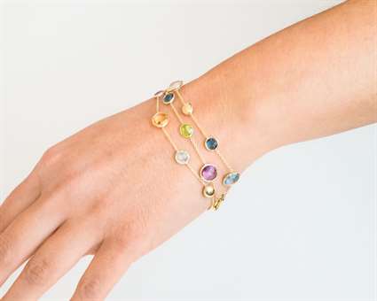 Buntes 3- reihiges Armband aus 585 Gelbgold. Bestehend aus Anker rund 1,1 mm verbunden mit 17 gefassten Farbsteinen ( Topas, Peridot, Amethyst, Citrin, Rosenquarz ) in unterschiedlichen Größen ( von 6,5 - 9,0 mm ), zwei polierten 6 mm Goldlinsen und einen Karabiner-Verschluss.