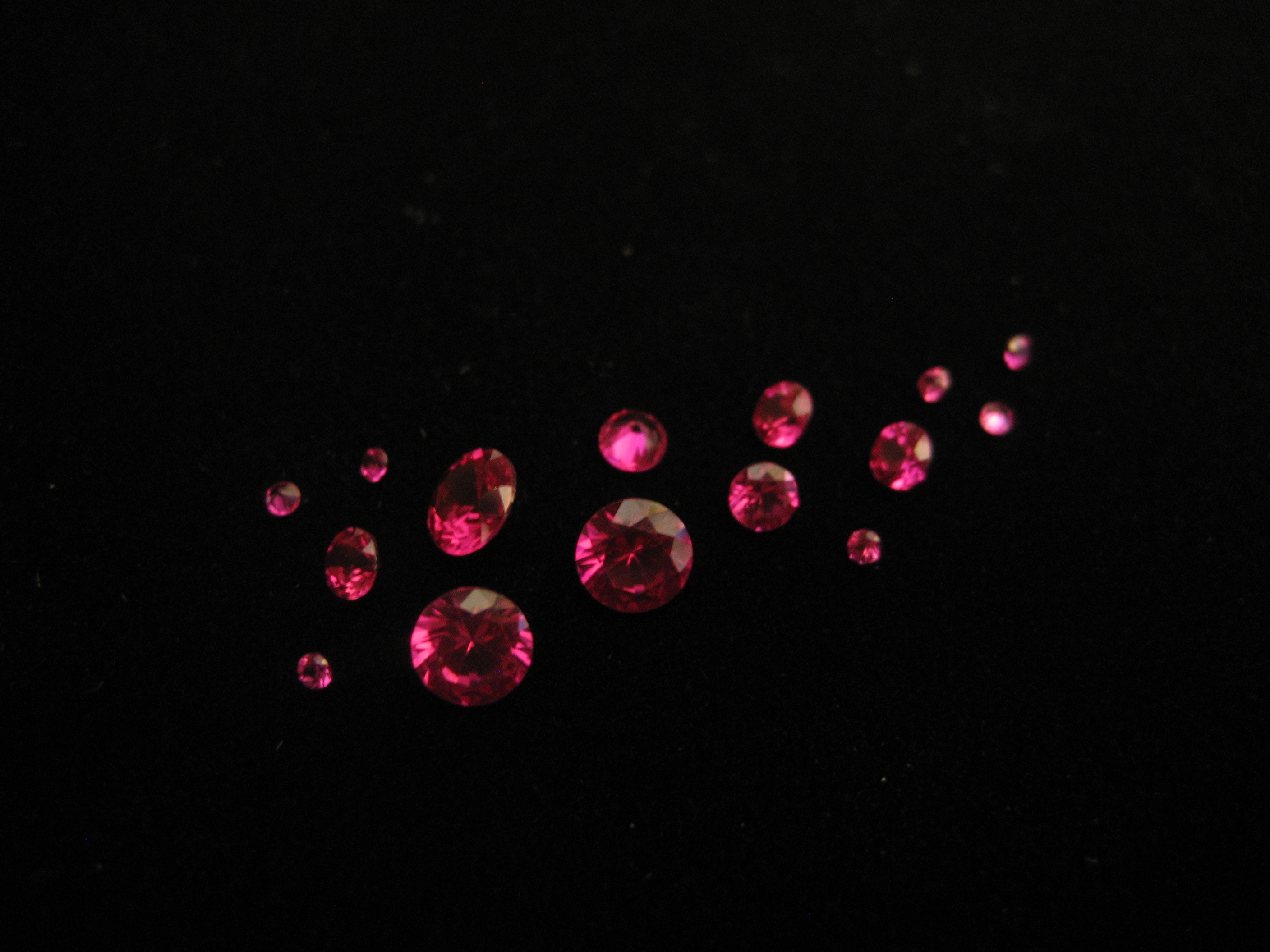 Synthetischer Korund (Edelsteinimitation) im Brillantschliff. Farbe: Rubin-Rot / Pink. Ø 1,5 mm ; h=1,2 mm