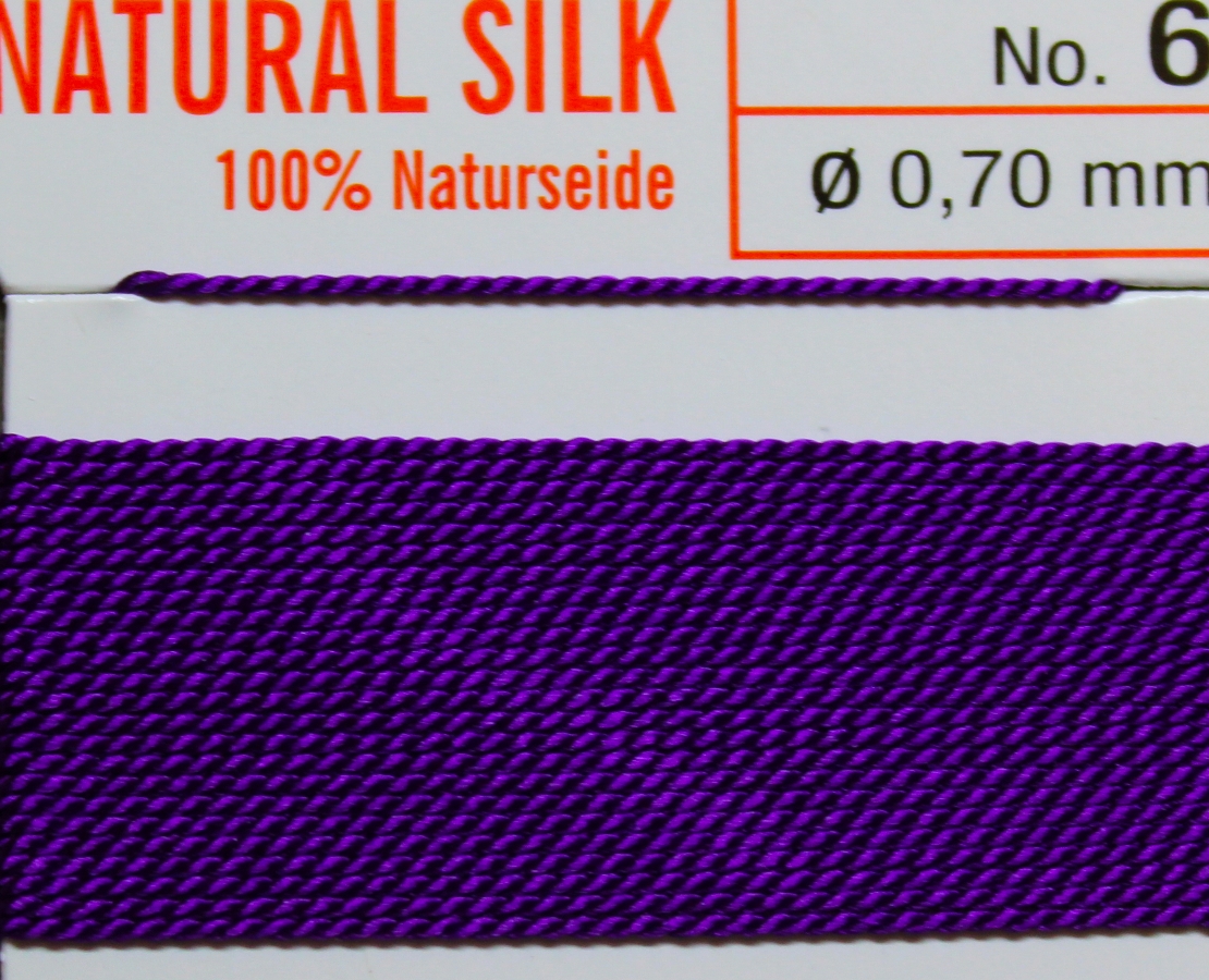 Durch ihre gute Reißfestigkeit und ihre geringe Dehnung lässt sich die Perlseide, aus 100% Naturseide, sehr gut verarbeiten und knüpfen. Der 2 m lange Kordelfaden ist mit 1 Nadel versehen. Perlseide - Farbe: Amethist = dunkles Violett - Nr.4 = Ø 0,6 mm