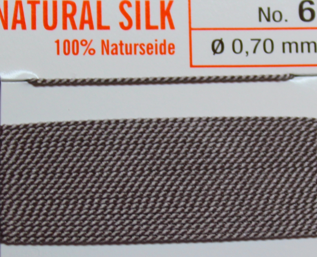 Durch ihre gute Reißfestigkeit und ihre geringe Dehnung lässt sich die Perlseide, aus 100% Naturseide, sehr gut verarbeiten und knüpfen. Der 2 m lange Kordelfaden ist mit 1 Nadel versehen. Perlseide - Farbe: grau - Nr. 4 = Ø 0,60 mm